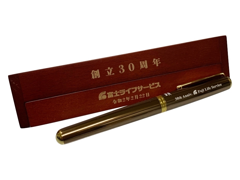 ボールペン、木製ケースに彫刻加工 (創立記念品) |